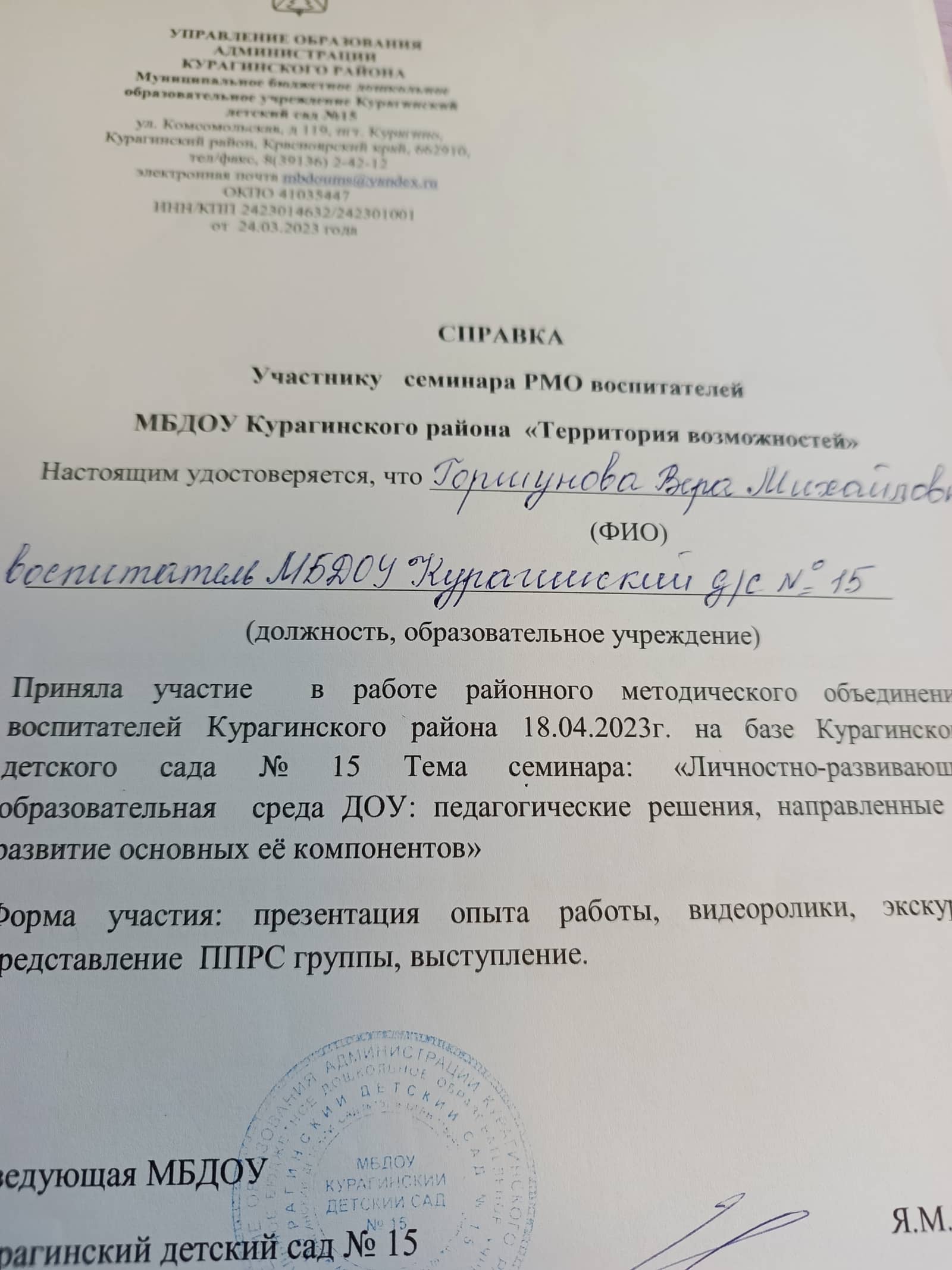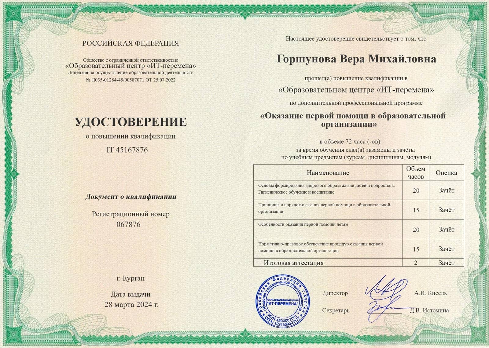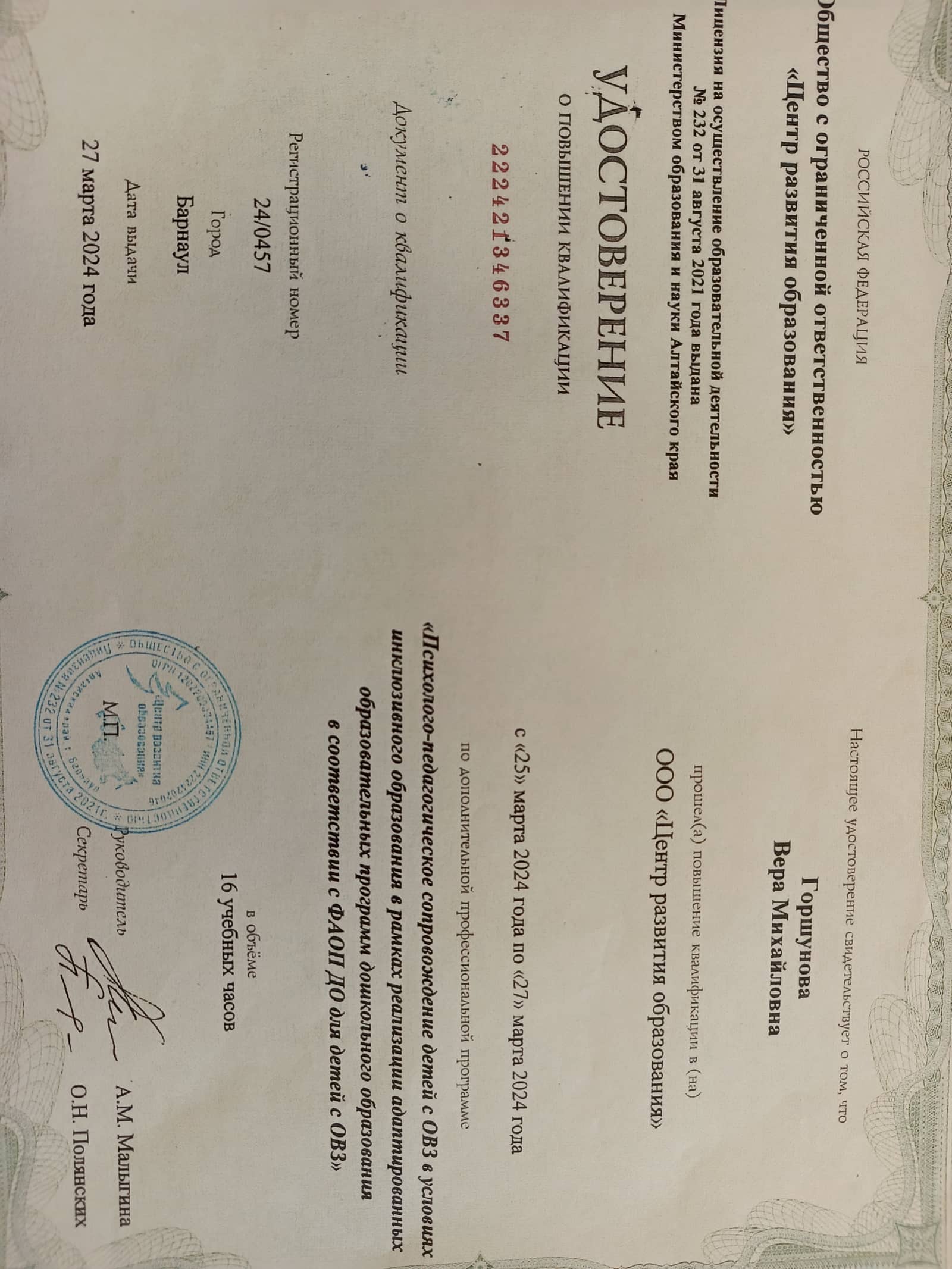 2018г — Теоретические основы оказания первой медицинской помощи 16ч «Актион — МЦФЭР»; 2018г — Создание специальных условий для детей с ОВЗ по ФГОС ДО» - 72ч «Актион — МЦФЭР»;2019г -"Проектирование образовательного процесса в группах комбинированной и компенсирующей направленности" 144ч 2021г - ПРофилактика гриппа и острых респираторных вирусных инфекций, в том числе новой короновирусной инфекции 2021г - Развитие личностнного потенциала в системе взаимодействия ключевых участников образовательных отношений 2022г - Проектирование образовательного процесса на основе ООП "Вдохновение" 2023г – «Внедрение ФОП дошкольного образования» (36ч), центр дополнительного профессионального образования ООО «Центр повышения квалификации и переподготовки «Луч знаний» г. Москва; участие в мониторинге качества дошкольного образования с использованием Инструментария МКДО для детей от 0 до 7 лет в роли педагога. 2024г - «Психолого-педагогическое сопровождение детей с ОВЗ и их родителей в условиях ДОО в рамках реализации адаптированных образовательных программ дошкольного образования в соответствии с ФАОП» (16ч), ООО Центр развития образования г. Барнаул. 2025г - «Организация работы с обучающимися с ОВЗ в соответствии с ФГОС» (36ч), центр дополнительного профессионального образования ООО «Центр повышения квалификации и переподготовки «Луч знаний» г. Москва |