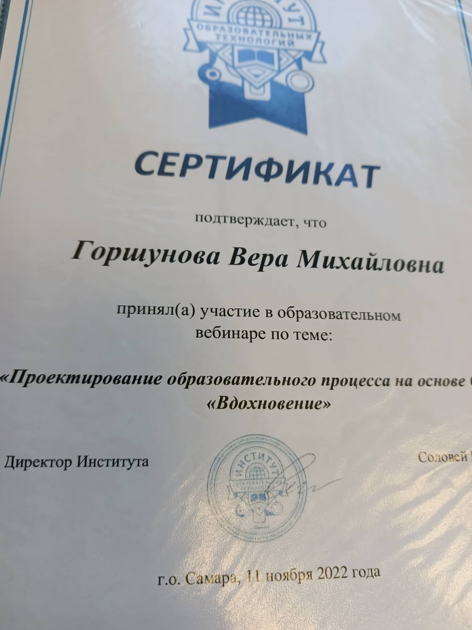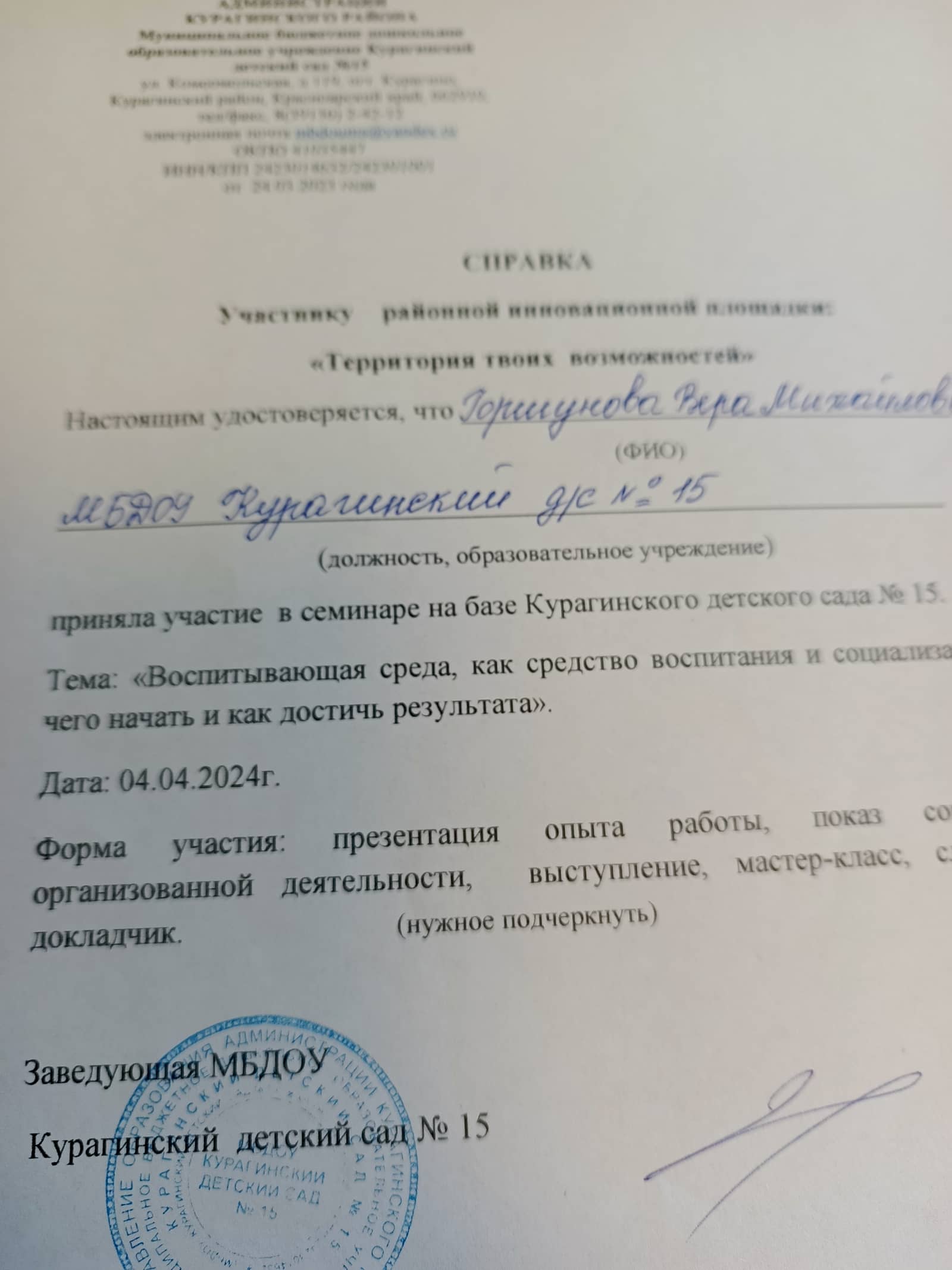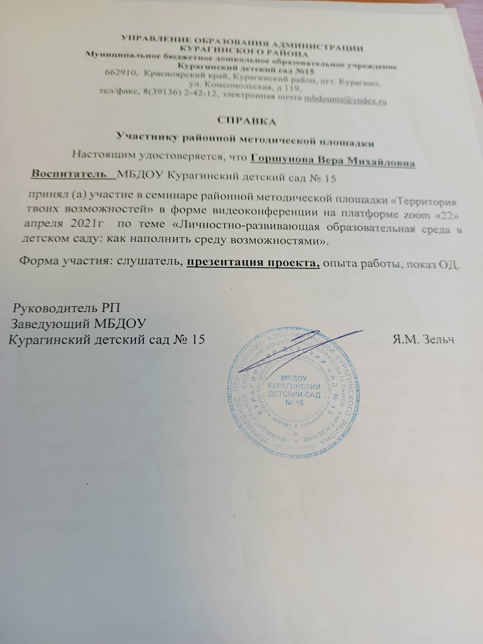 2018г — Теоретические основы оказания первой медицинской помощи 16ч «Актион — МЦФЭР»; 2018г — Создание специальных условий для детей с ОВЗ по ФГОС ДО» - 72ч «Актион — МЦФЭР»;2019г -"Проектирование образовательного процесса в группах комбинированной и компенсирующей направленности" 144ч 2021г - ПРофилактика гриппа и острых респираторных вирусных инфекций, в том числе новой короновирусной инфекции 2021г - Развитие личностнного потенциала в системе взаимодействия ключевых участников образовательных отношений 2022г - Проектирование образовательного процесса на основе ООП "Вдохновение" 2023г – «Внедрение ФОП дошкольного образования» (36ч), центр дополнительного профессионального образования ООО «Центр повышения квалификации и переподготовки «Луч знаний» г. Москва; участие в мониторинге качества дошкольного образования с использованием Инструментария МКДО для детей от 0 до 7 лет в роли педагога. 2024г - «Психолого-педагогическое сопровождение детей с ОВЗ и их родителей в условиях ДОО в рамках реализации адаптированных образовательных программ дошкольного образования в соответствии с ФАОП» (16ч), ООО Центр развития образования г. Барнаул. 2025г - «Организация работы с обучающимися с ОВЗ в соответствии с ФГОС» (36ч), центр дополнительного профессионального образования ООО «Центр повышения квалификации и переподготовки «Луч знаний» г. Москва |
