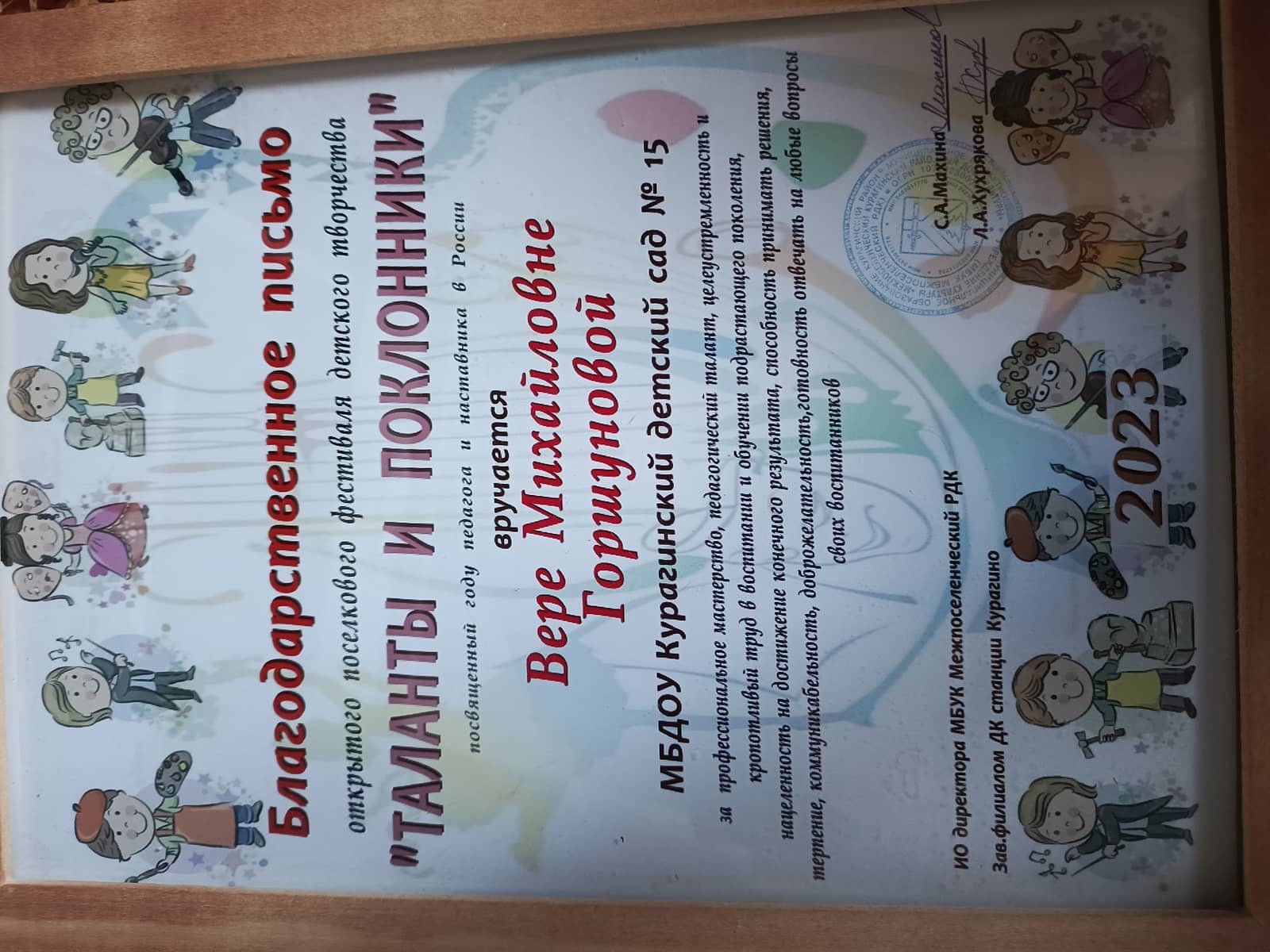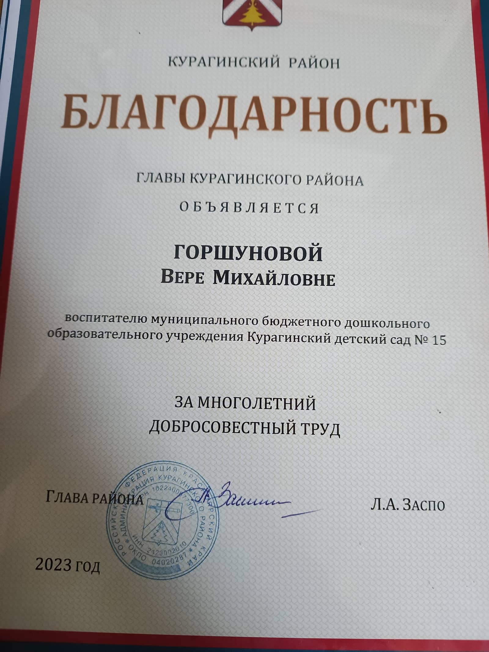 2018г — Создание специальных условий для детей с ОВЗ по ФГОС ДО» - 72ч Негосударственное образовательное частное учреждение организации дополнительного профессионального образования «Актион — МЦФЭР»;2023г – «Внедрение ФОП дошкольного образования» (36ч), центр дополнительного профессионального образования ООО «Центр повышения квалификации и переподготовки «Луч знаний» г. Москва.