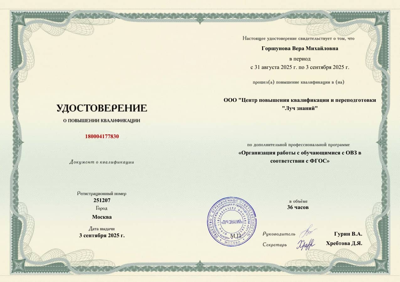 2025 г - «Организация работы с обучающимися с ОВЗ в соответствии с ФГОС», центр дополнительного профессионального образования ООО «Центр повышения квалификации и переподготовки «Луч знаний» г. Москва (36ч)