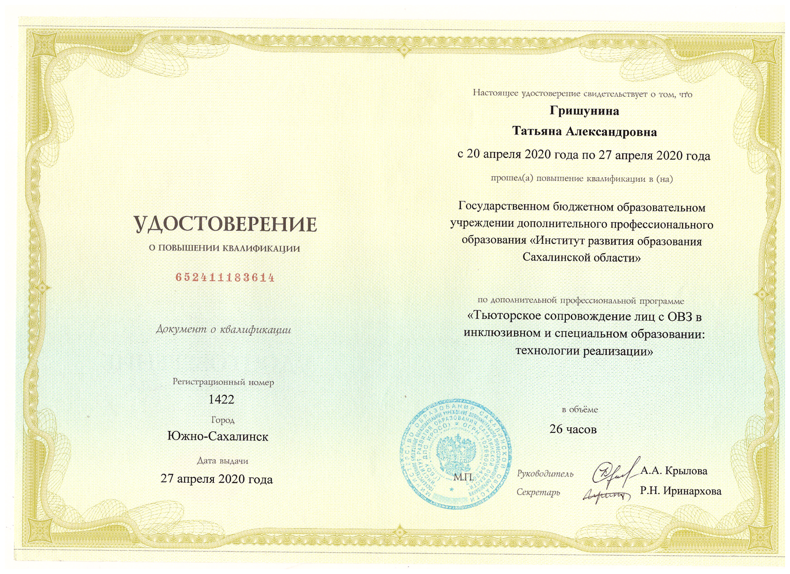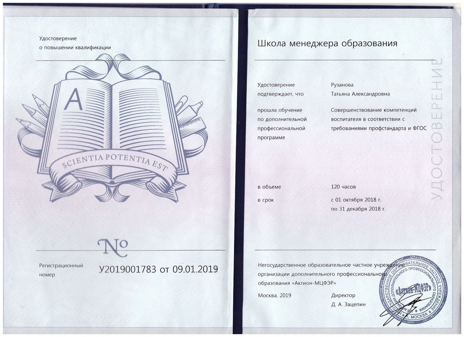 2024г - «Внедрение Федеральной образовательной программы дошкольного образования» (36ч), «Организация работы с обучающимися с ограниченными возможностями здоровья (ОВЗ) в соответствии с ФГОС (72ч)
