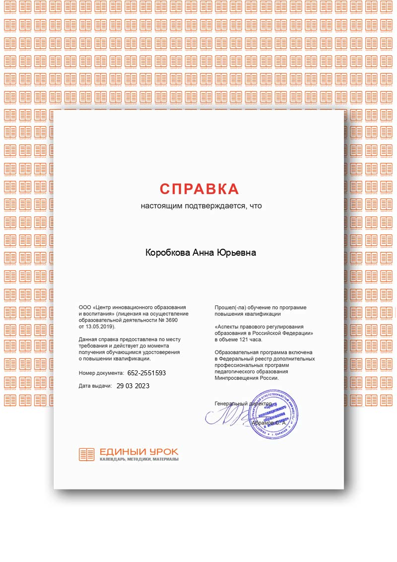 2023г. Аспекты правового регулирования образования Российской Федерации ( 121 час);