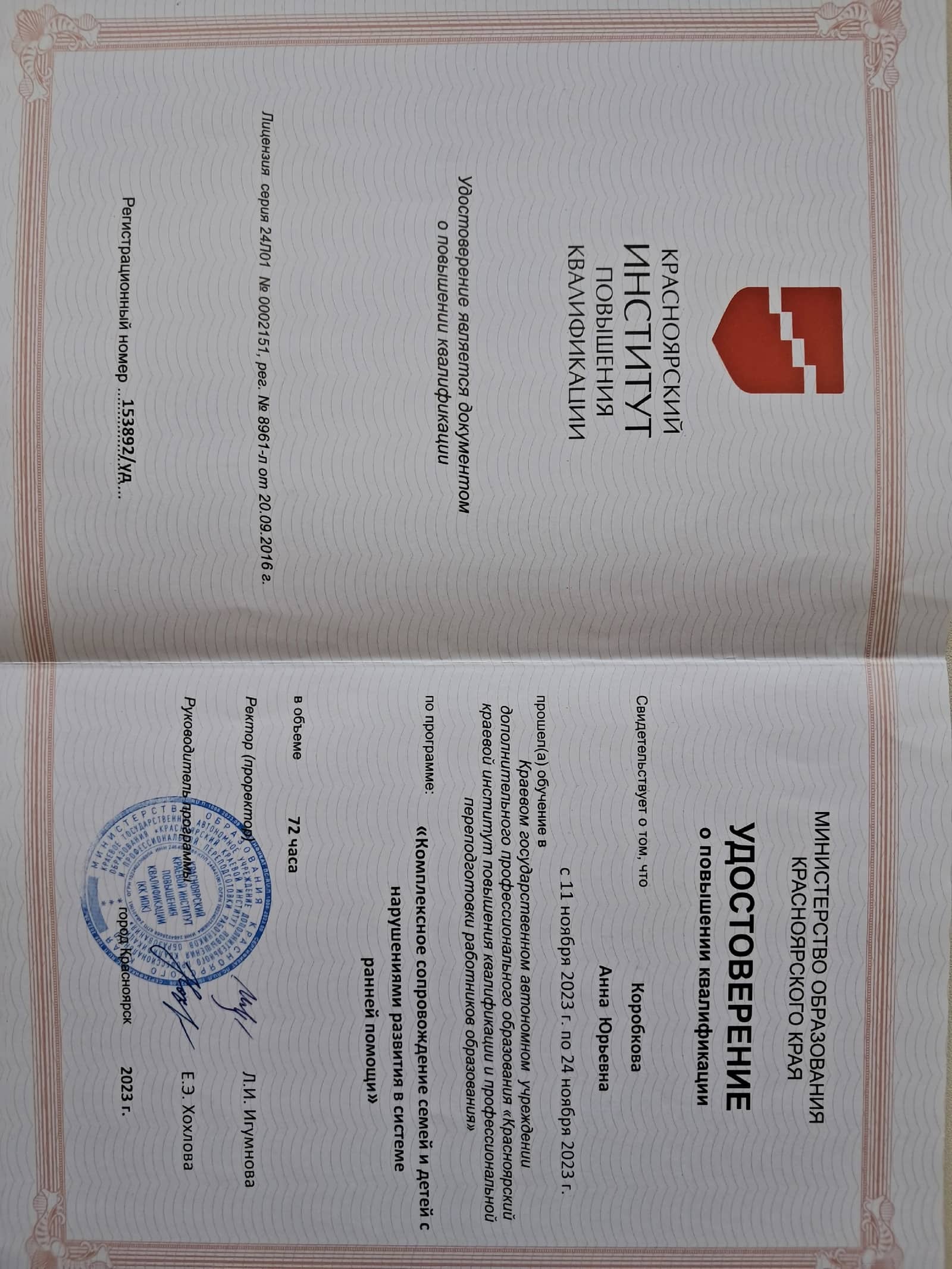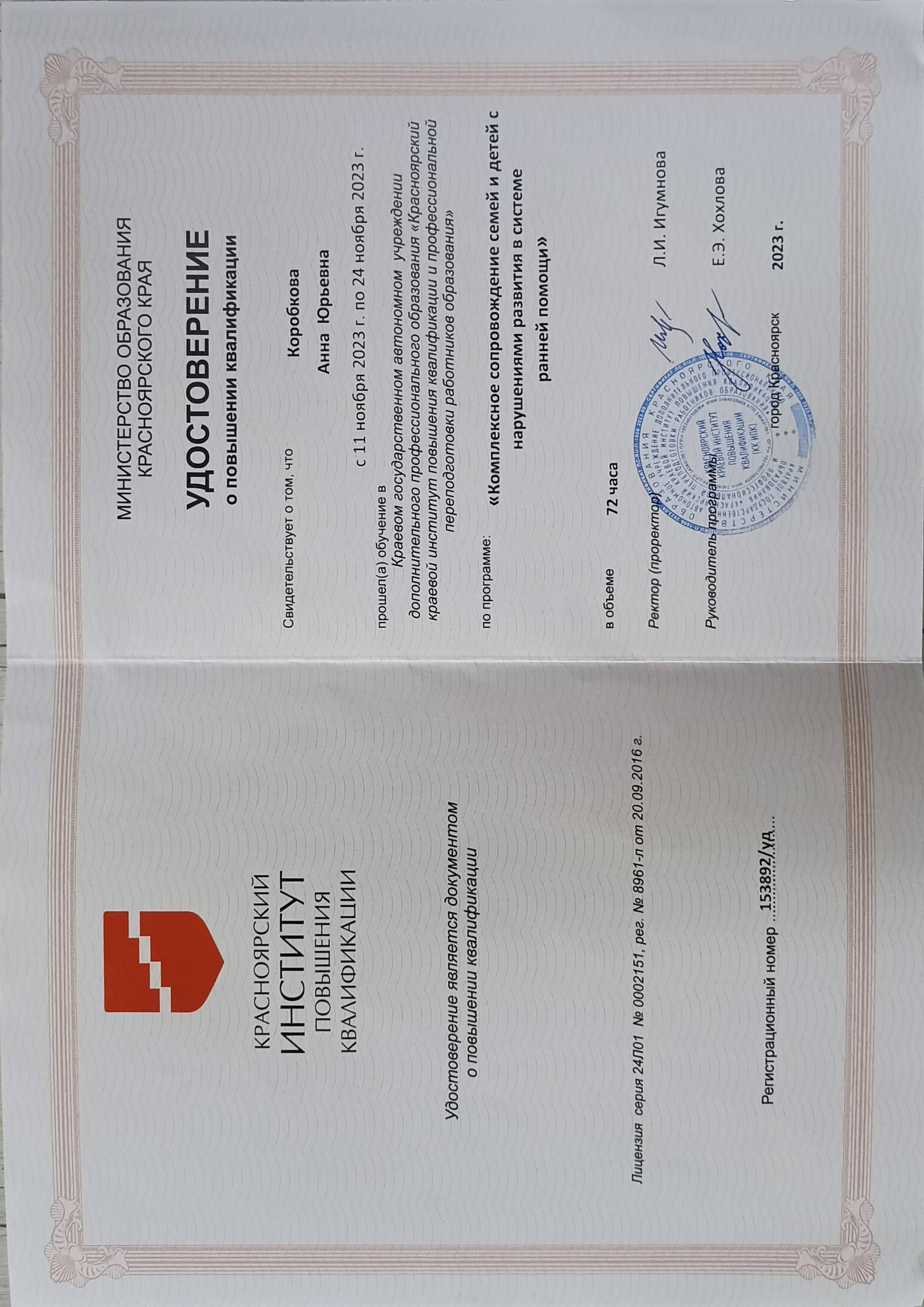 2023г. Комплексное сопровождение семей и детей с нарушениями развития в системе ранней помощи (72 часа);