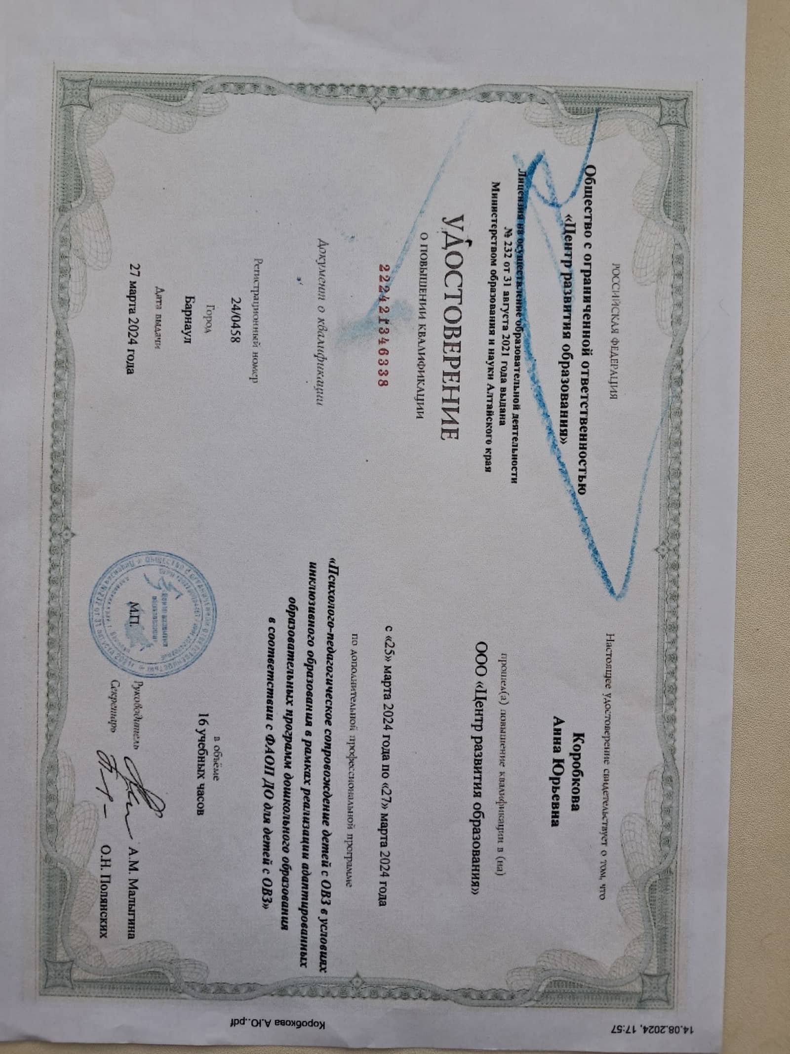2024г. Психолого-педагогическое сопровождение детей с ОВЗ в условиях инклюзивного образования в рамках реализации адаптированных образовательных программ дошкольного образования в соответствии с ФАОП ДО для детей с ОВЗ. (16 часов);
