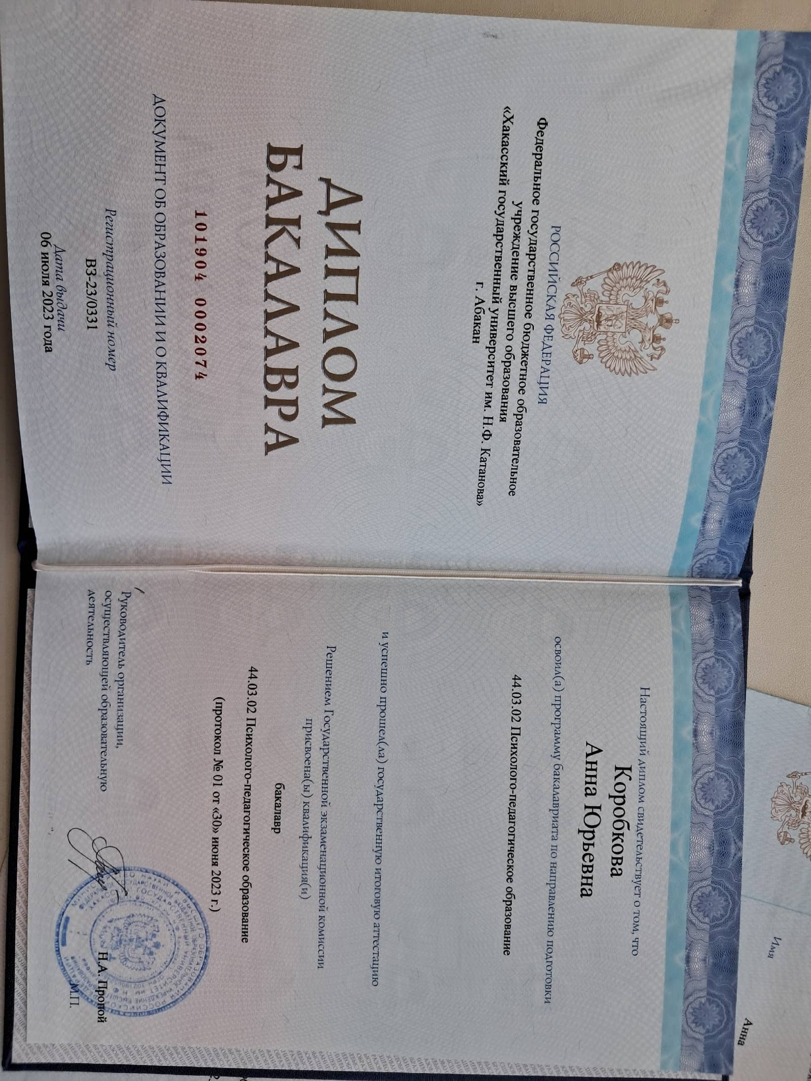 Специальность — психолого-педагогическое образование; Квалификация — бакалавр; ВЗ-23/0331