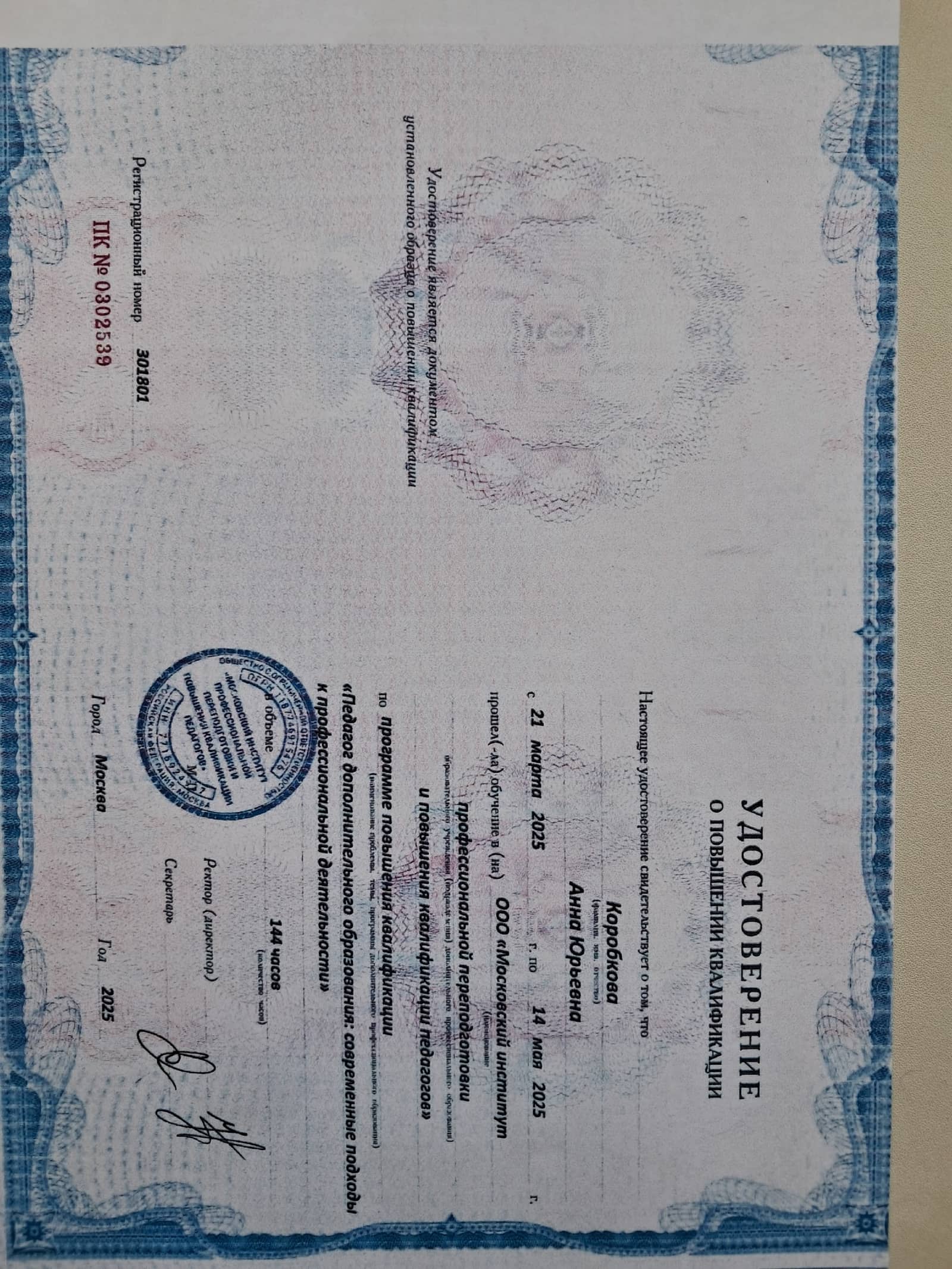 Повышение квалификации за последние три года: