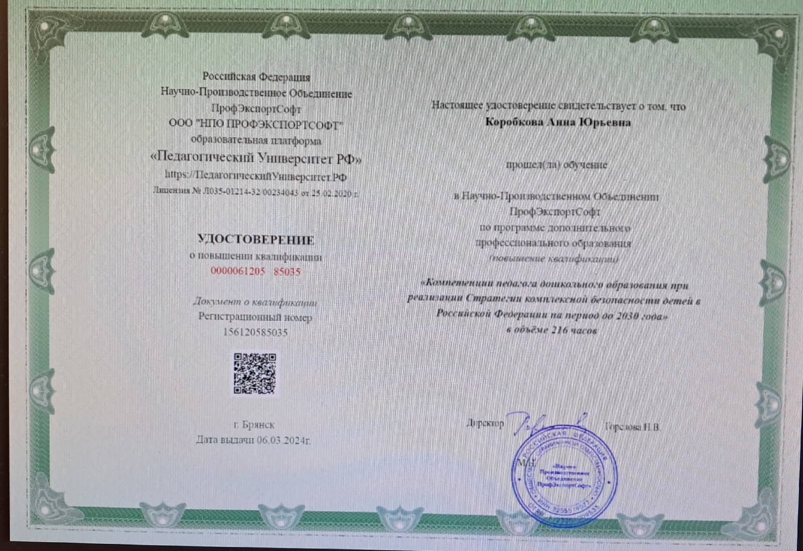 2024г. Компетенции педагога дошкольного образования при реализации Стратегии комплексной безопасности детей в Российской Федерации на период до 2030 года (216 часов);