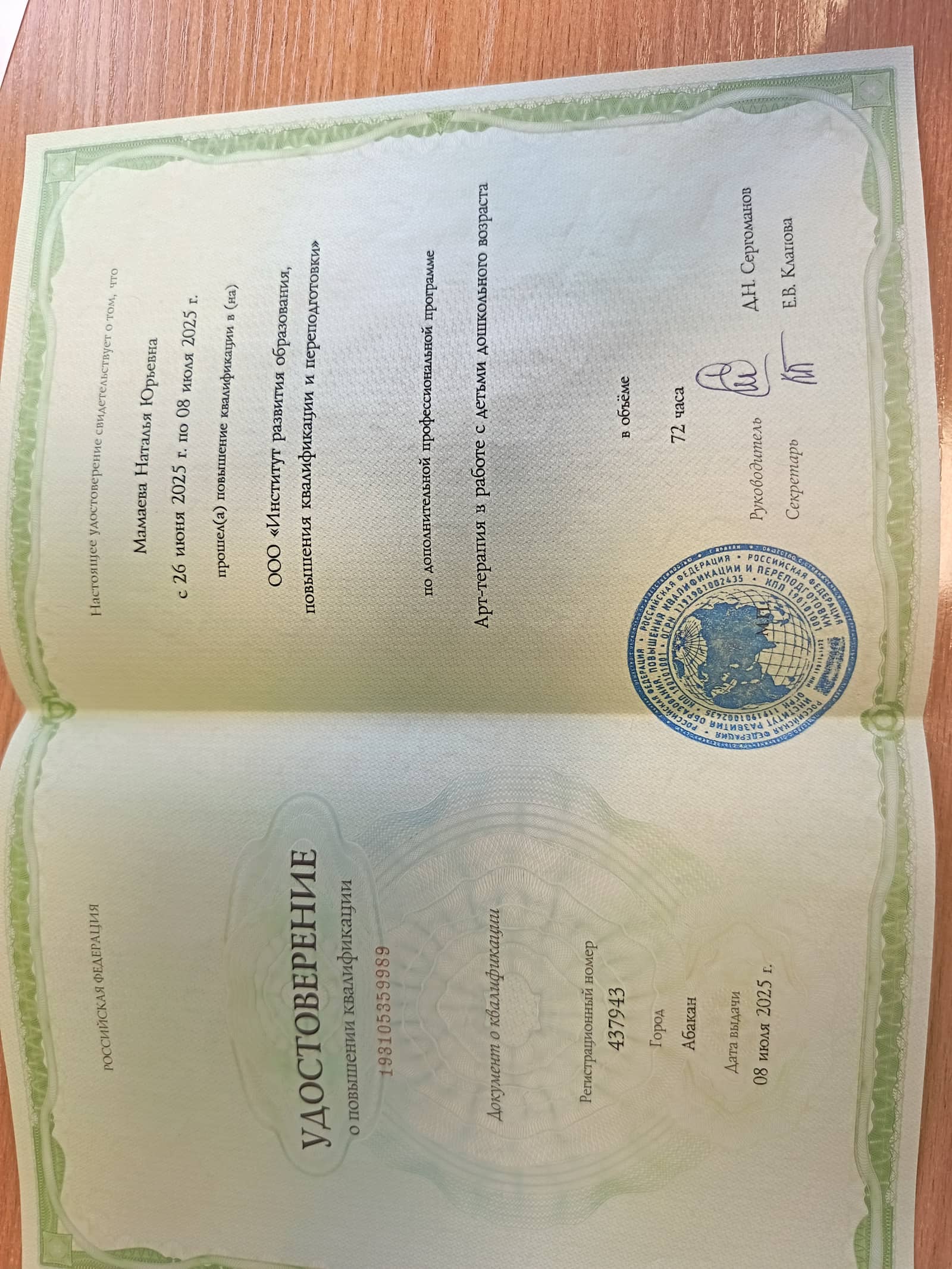 2025г - "Арт-терапия в работе с детьи дошкльного возраста" (72ч) Абаканский Институт развития образования, повышения квалификации и переподготовки"